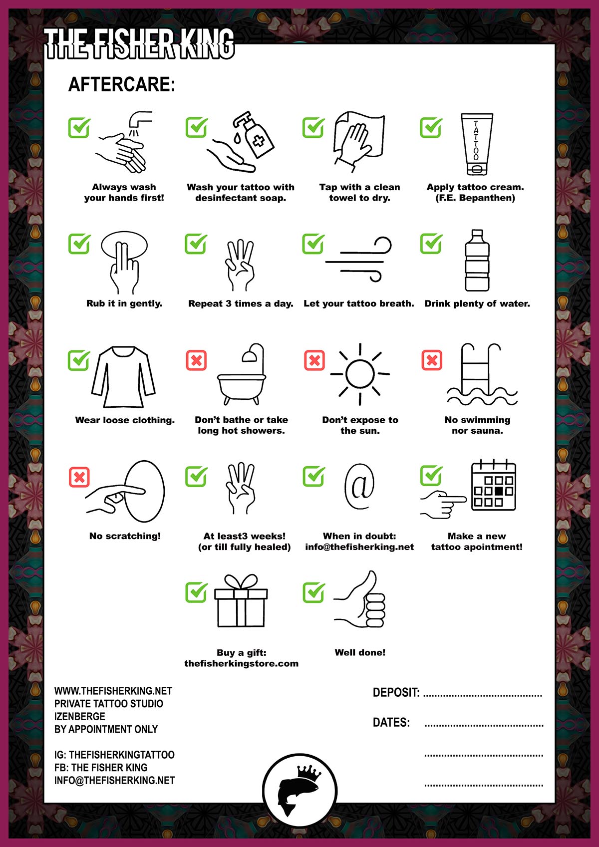 De achterkant? Die draait om duidelijkheid. Met zelfontworpen icoontjes die stap voor stap tonen wat je wél en niét moet doen om je tattoo goed te laten genezen.